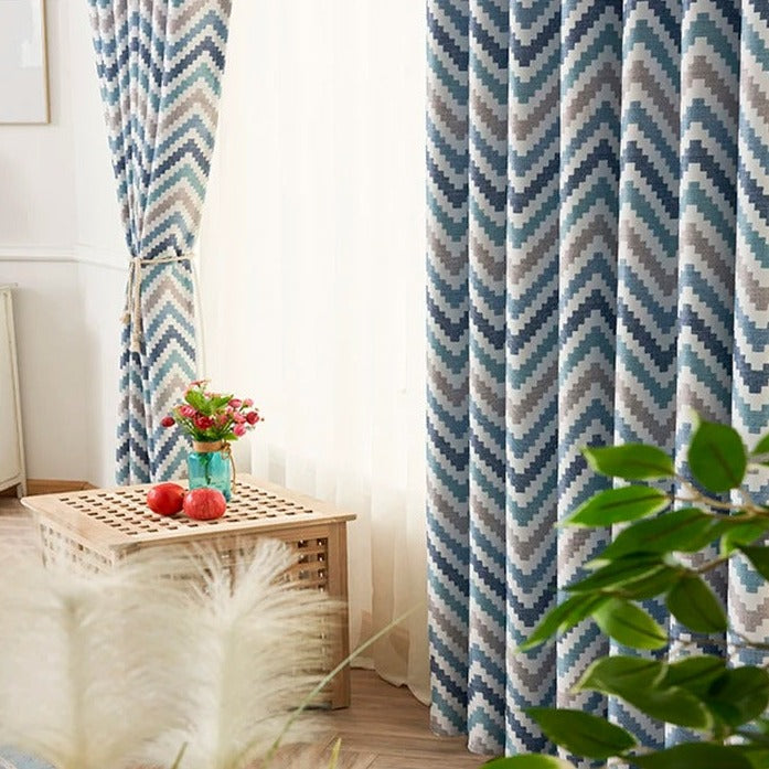 Din Blå mørkleggingsgardin med chevron-mønster er den perfekte løsningen for et stilrent og funksjonelt hjem.