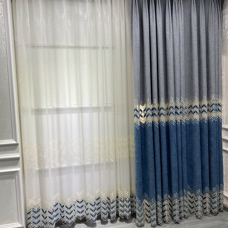 Denne gardinen er mer enn bare et stoffstykke; den er en investering i ditt hjem og din trivsel. Vi har designet den med tanke på deg som ønsker å skape et personlig og stilfullt uttrykk. Tenk deg hvordan det myke lyset filtreres gjennom det vakre broderiet, og hvordan mønsteret spiller sammen med resten av interiøret ditt. Gardinen er laget av høykvalitets fløyel som ikke bare ser fantastisk ut, men også føles utrolig myk. Det intrikate geometriske mønsteret er brodert med presisjon, noe som gir gardinen en eksklusiv og håndlaget følelse. Du vil legge merke til hvordan fargene – dype blåtoner, rolige gråfarger og hint av hvitt – skaper en harmonisk balanse som passer perfekt inn i mange forskjellige stiler, fra moderne til klassisk.