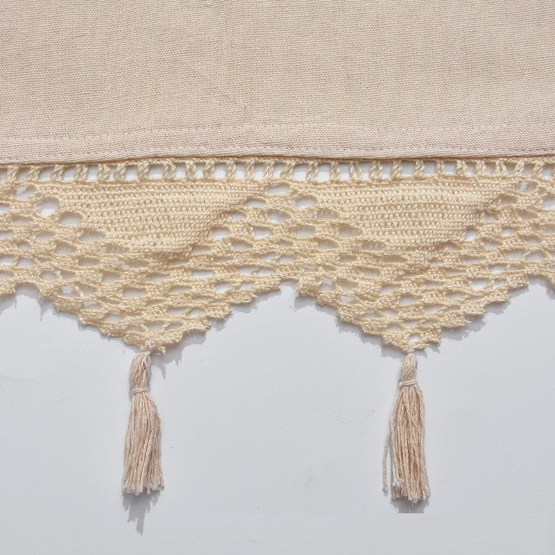 Denne kjøkkengardinen er mer enn bare et vinduspryd; den er et statement av stil og hygge. Det intrikate broderiet i midten gir en følelse av håndverk og kvalitet, og de små perforeringene lar lyset danse gjennom, noe som skaper en lett og luftig følelse. Tenk deg å sitte ved kjøkkenbordet med en kopp kaffe, mens denne gardinen rammer inn utsikten din og tilfører en rolig og behagelig stemning. Nederst er gardinen pyntet med en vakker heklet blondekant og en rekke søte dusker som svinger lett i brisen. Dette gir et lekent, men sofistikert preg som skiller den fra vanlige gardiner. Den nøytrale fargen gjør at den passer inn i de fleste interiørstiler, fra det rustikke til det mer moderne.