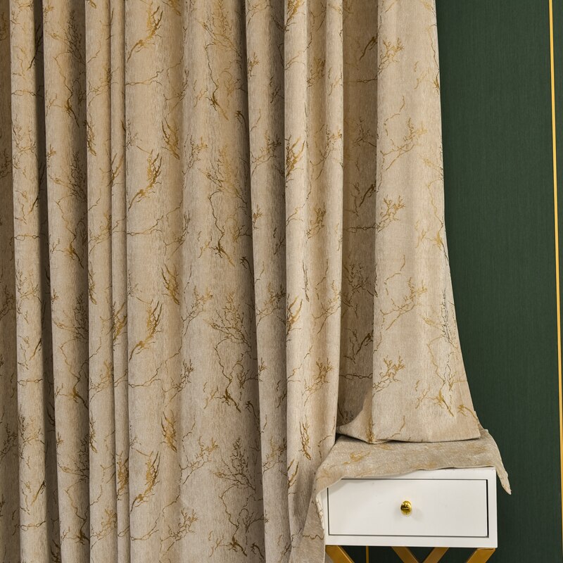 Våre gardiner er mer enn bare funksjonelle; de er en viktig del av innredningen din. Det subtile, men allikevel slående, gyllne mønsteret er inspirert av naturens egne kunstverk, med intrikate linjer som minner om delikate greiner eller abstrakte marmorårer. Når solen skinner gjennom, kommer mønsteret til live, og skaper et dynamisk spill av lys og skygge som fortryller øyet. Materialet er valgt for sin vakre drapering og myke tekstur, som bidrar til en følelse av komfort og luksus.