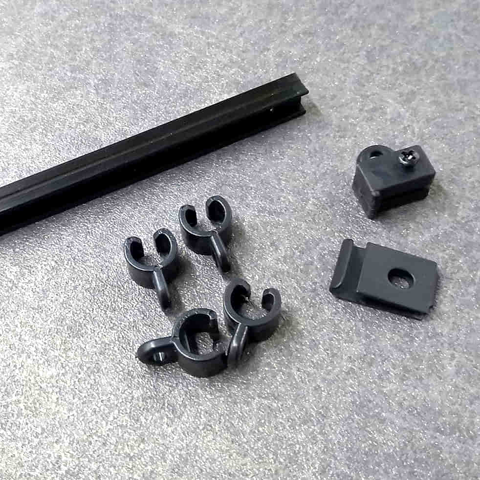 - Dimensjoner: Skinnen er 1 cm høy, 2.3 cm dyp der krokene festes, og endestykkene er 1.5 cm brede og 2 cm høye.