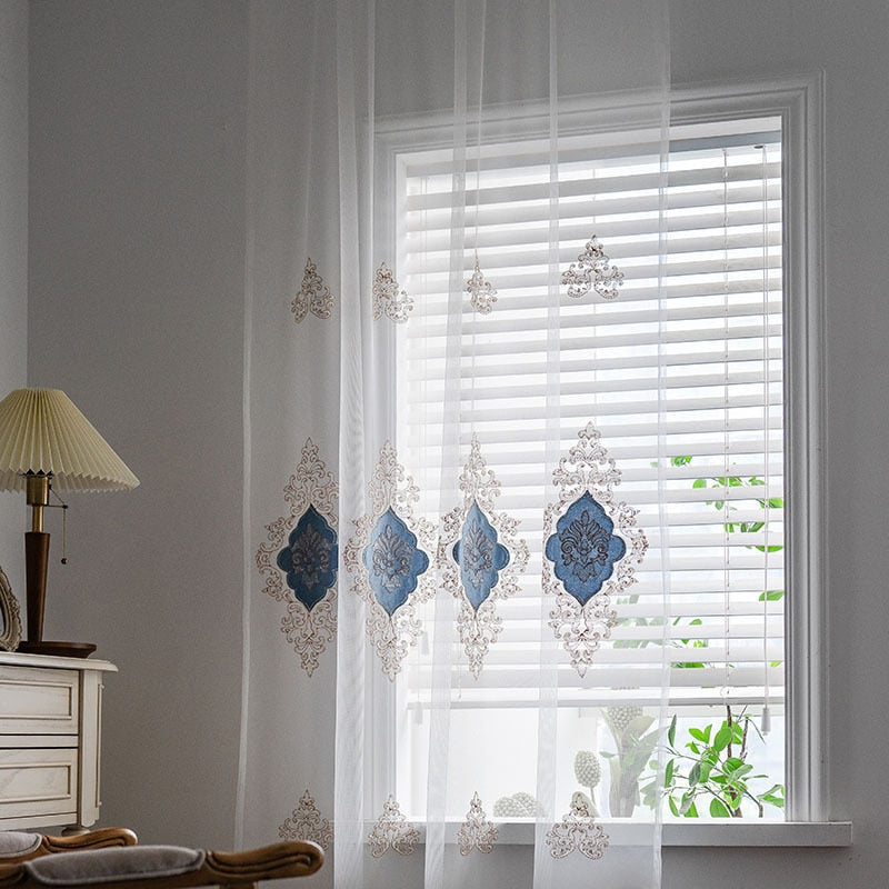 Denne gardinen er nøye designet for å kombinere funksjonalitet med utsøkt estetikk. Det lette, gjennomsiktige stoffet lar rikelig med naturlig lys strømme inn, samtidig som det gir et visst privatliv og en luftig følelse i rommet. De fremtredende barokkmotivene, brodert i en dyp, beroligende blåfarge og aksentert med glitrende gulltråder, skaper et slående visuelt fokuspunkt. Hvert motiv er utført med presisjon, noe som understreker håndverkets kvalitet og gardinens eksklusive karakter. Den vil uten tvil tiltrekke seg beundrende blikk og starte samtaler, og forvandle ethvert rom til et mer innbydende og stilig miljø.