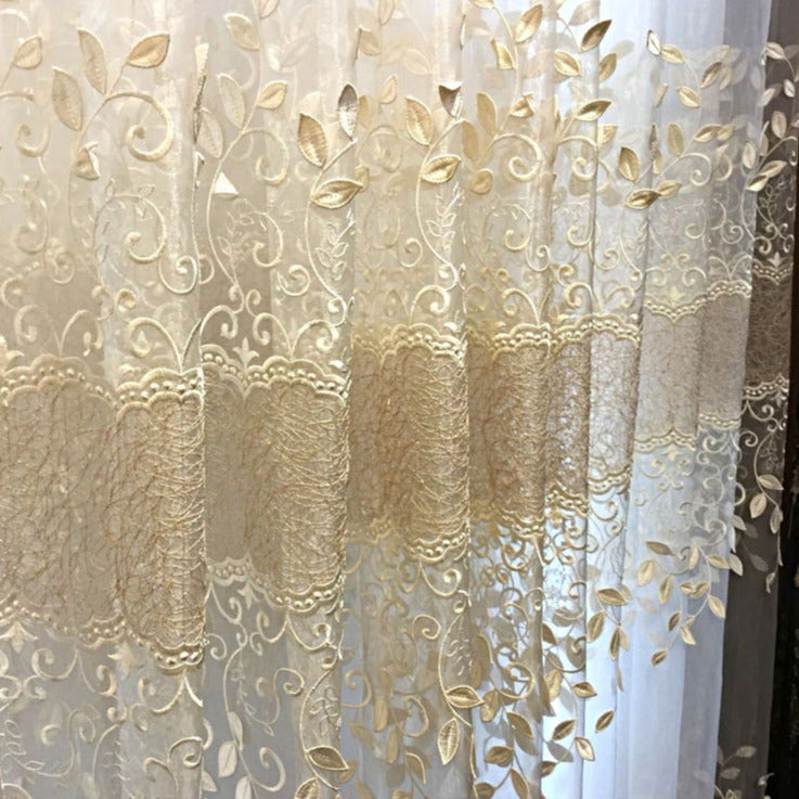 Vår florlett gardin med gyllent broderi er mer enn bare et vindu-deksel; det er et kunstverk. Hvert broderi er nøye utført, og viser et mønster av blader og ruller som gir gardinen en organisk og tidløs appell. Den øvre delen av gardinen har et mer åpent broderimønster, mens den nedre delen har et tett, intrikat mønster som gir tekstur og dybde. Stoffet er lett og luftig, perfekt for å skape en følelse av rom og lys, samtidig som det tilbyr et hint av privatliv. Denne gardinen er ideell for de som ønsker å tilføre varme, glans og en touch av klassisk skjønnhet til sine rom. Tenk deg den beroligende lyden av gardinen som svaier forsiktig i brisen, mens solen skinner gjennom og fremhever det glitrende broderiet.