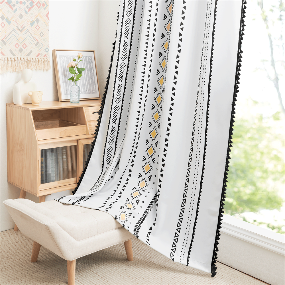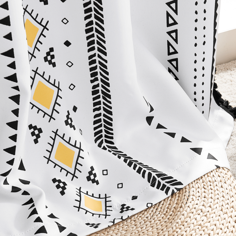 Denne gardinen er designet for å gi hjemmet ditt en umiddelbar oppgradering. Den svarte og hvite fargepaletten med de gule aksentene gjør den allsidig nok til å passe inn i mange interiørstiler, fra bohemsk og skandinavisk til moderne og minimalistisk. Fordi mønsteret er så uttrykksfullt, kan gardinen fungere som et fokuspunkt i rommet, og du trenger ikke mange andre dekorasjoner for å skape et interessant uttrykk. Duskkantene gir en leken og avslappet følelse, og bidrar til en koselig og komfortabel stemning. Forestill deg å våkne opp til det myke lyset som siver gjennom stoffet, eller å slappe av om kvelden med gardinene trukket for, og la det unike designet inspirere deg.
