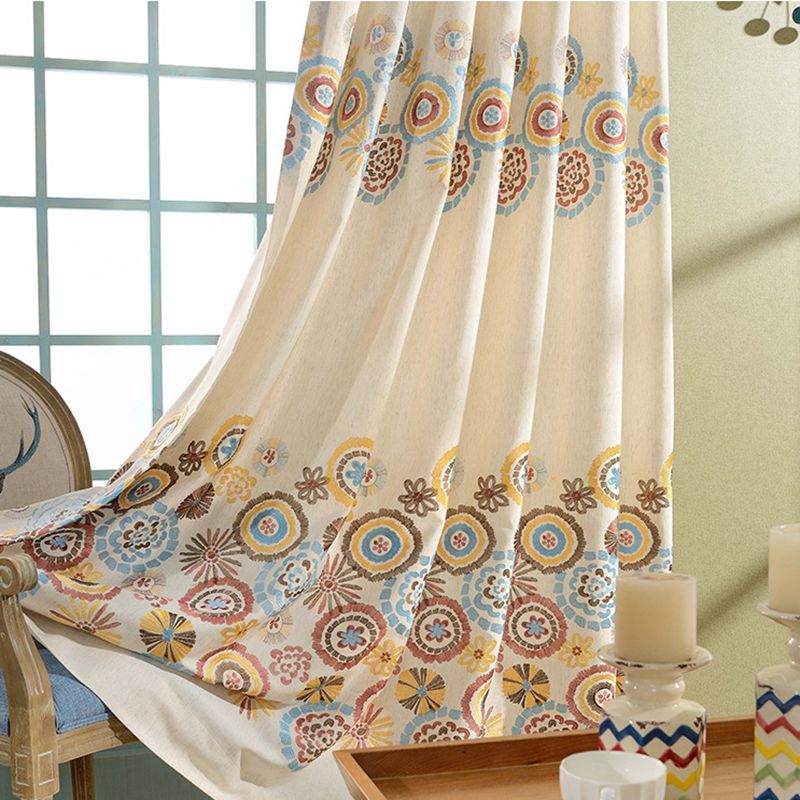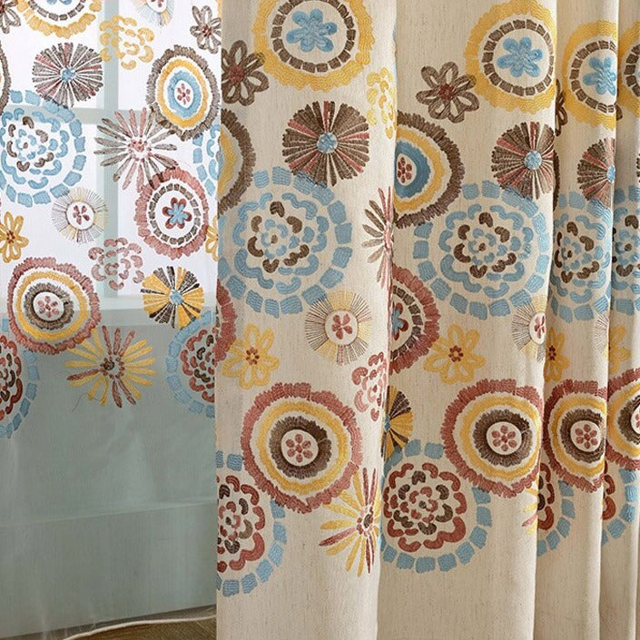 Hver eneste detalj på denne gardinen med fargerikt bohemsk mønster er designet for å gi deg glede og komfort. Med sine nydelige broderte sirkler og blomstermotiver i varme toner av gult, blått, brunt og rustrødt på en lys, nøytral bakgrunn, skaper den en følelse av ro og livlighet på samme tid. Den lette, men robuste kvaliteten gjør at den faller vakkert og gir akkurat passe mye privatliv, samtidig som den slipper inn tilstrekkelig med lys. Du vil elske hvordan den myke teksturen føles, og hvordan den umiddelbart løfter stemningen i ethvert rom. Dette er mer enn bare en gardin; det er en stemningsskaper som inviterer til avslapning og gode samtaler.