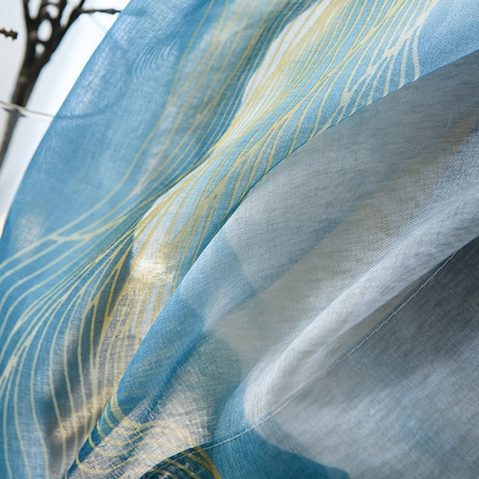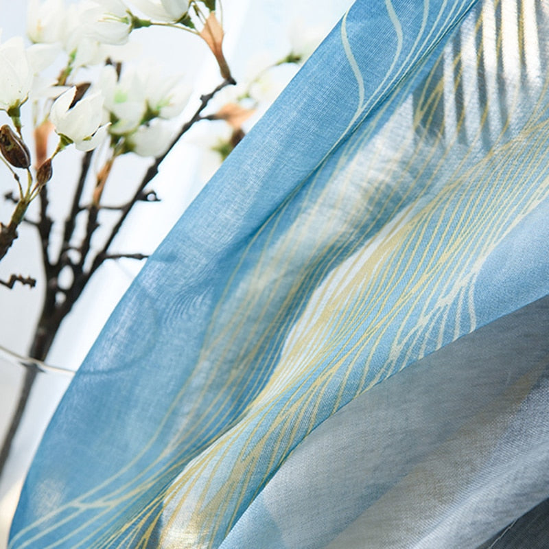 Denne gardinen er mer enn bare et vindusdressing; den er en følelse. Det lette stoffet gir en behagelig bris på varme dager, og det delikate mønsteret fanger lyset på en måte som ingen andre gardiner kan. Det er som å ha et kunstverk som endrer seg med tidspunktet på dagen. Føl den myke teksturen, se hvordan de gylne linjene vever seg gjennom den blå bakgrunnen, og forestill deg den rolige og innbydende atmosfæren den skaper. Vår gjennomsiktig gardin med gyllent bølgemønster er ikke bare et kjøp, det er en investering i velvære og stil for ditt hjem.