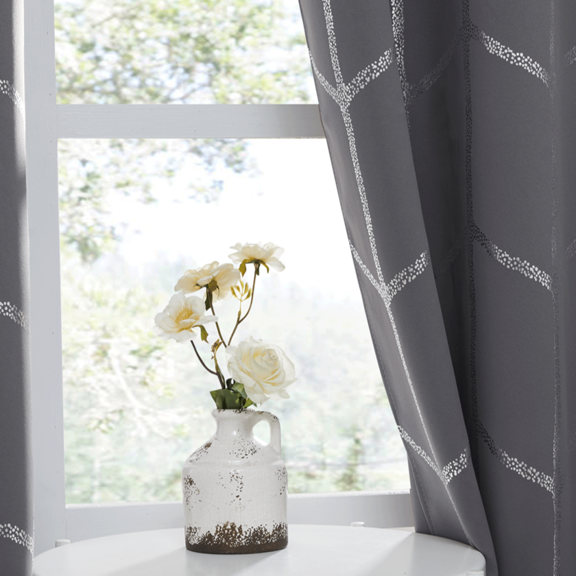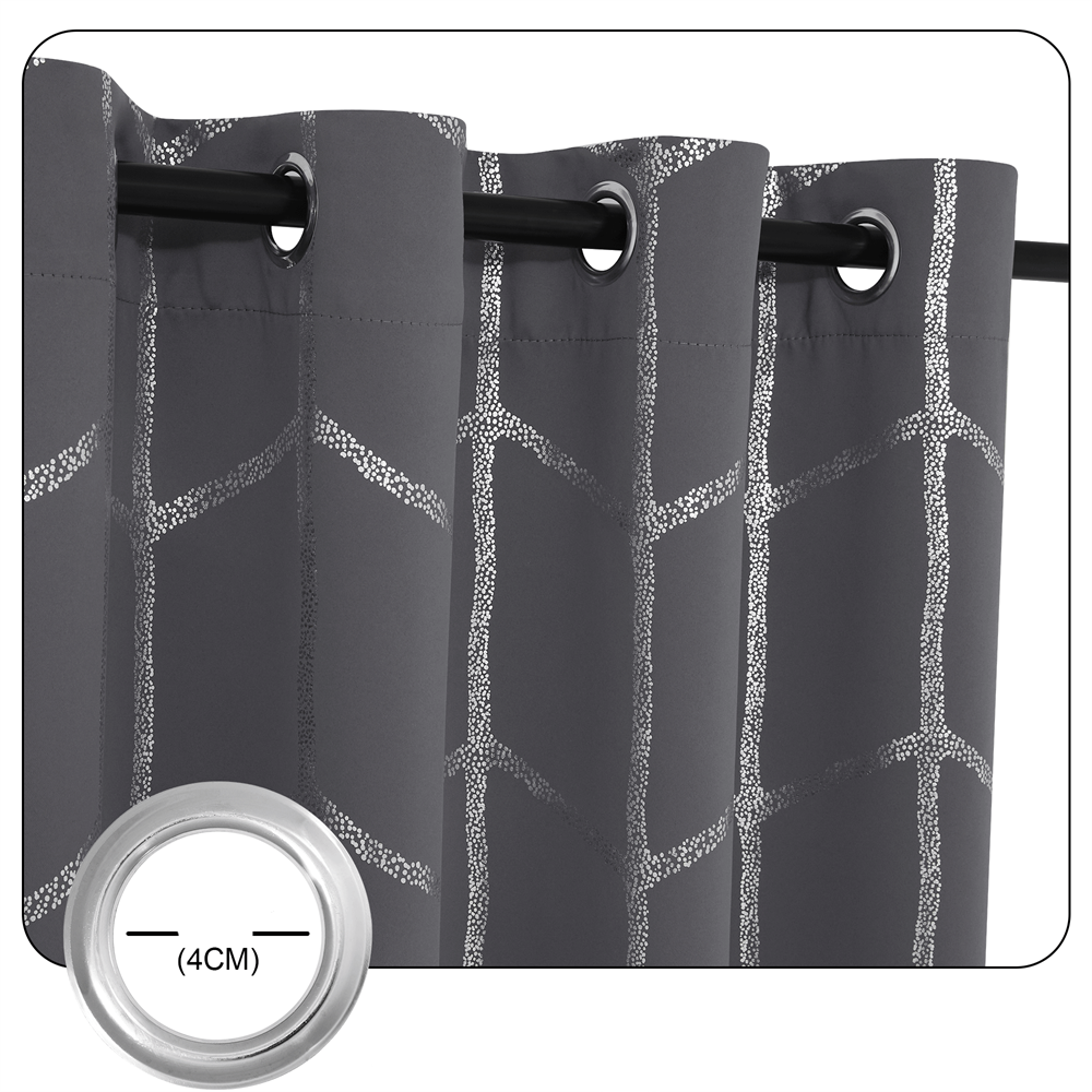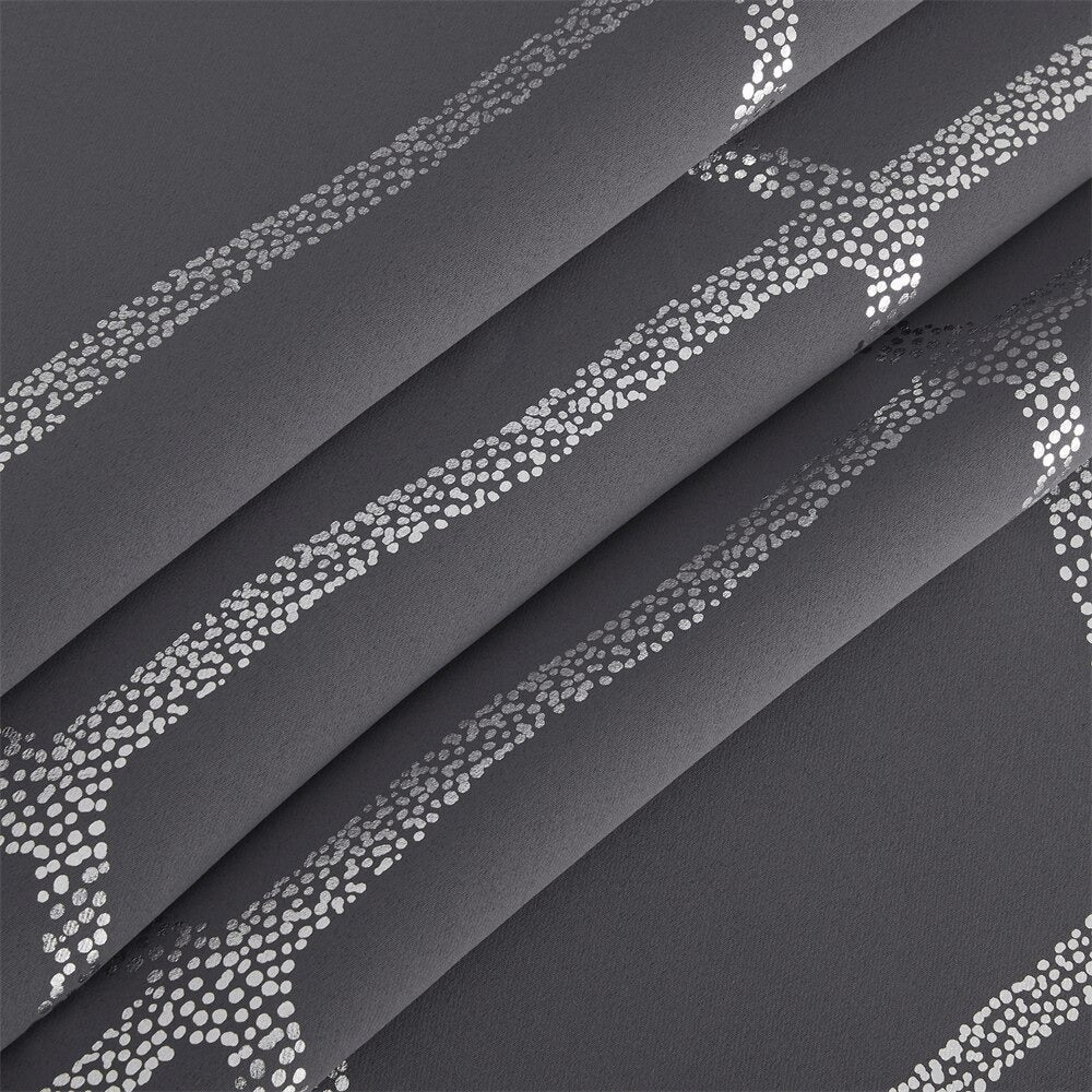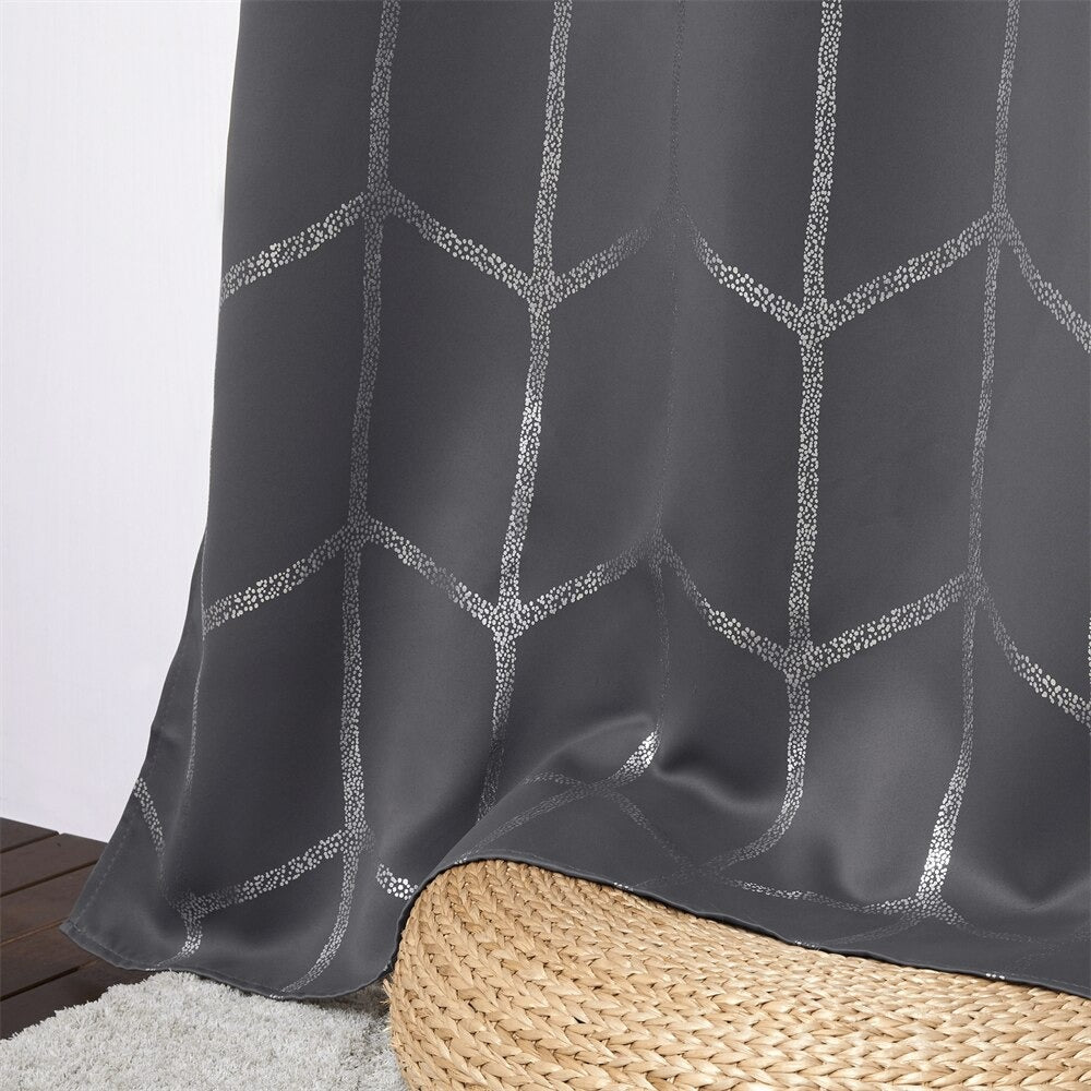 Forvandle rommet ditt med vårt elegante lystette gardin. Dette gardinet er ikke bare praktisk med sin utmerkede lysblokkering, men det tilfører også et moderne og sofistikert preg til ethvert rom takket være det iøynefallende geometriske sølvmønsteret. Forestill deg hvordan sollyset vil danse på det glitrende mønsteret, og skape en levende og luksuriøs atmosfære i ditt hjem. Med dette gardinet får du det beste av to verdener: optimal funksjonalitet og enestående design. Det er det perfekte valget for deg som ønsker å kombinere praktisk mørklegging med et trendy interiørelement.