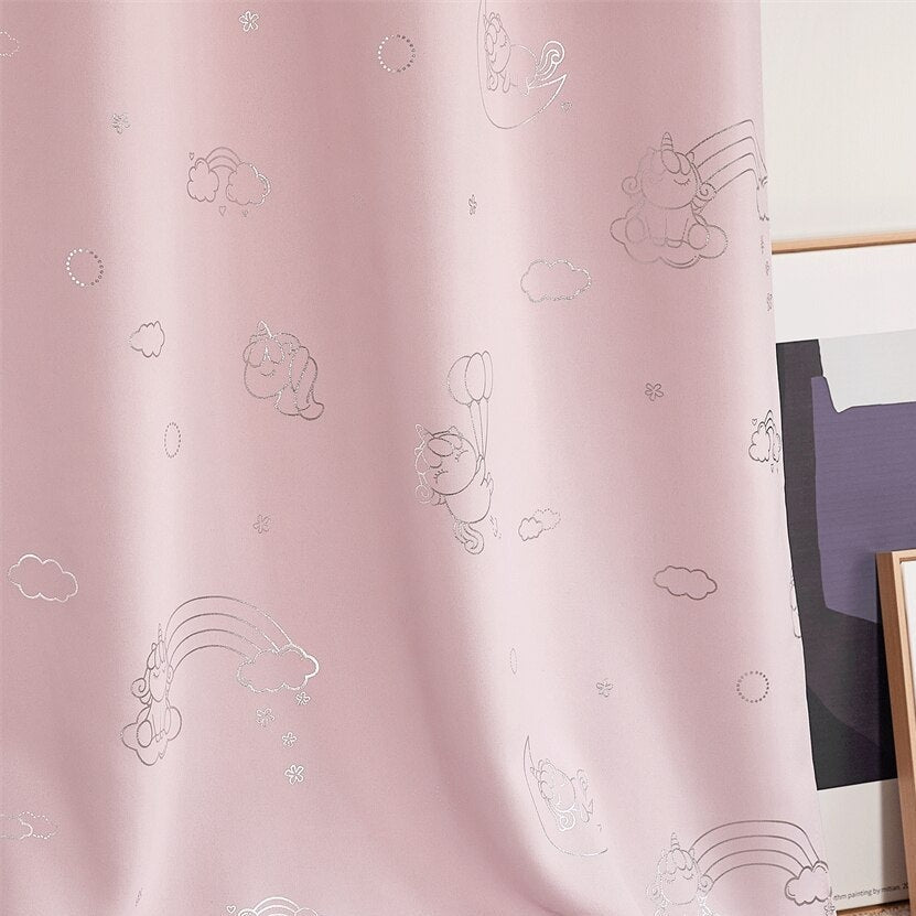 - Drømmende design: Med sølvfargede enhjørninger, regnbuer og ballonger på en delikat rosa bakgrunn, skaper gardinen en eventyrlig stemning i barnerommet.