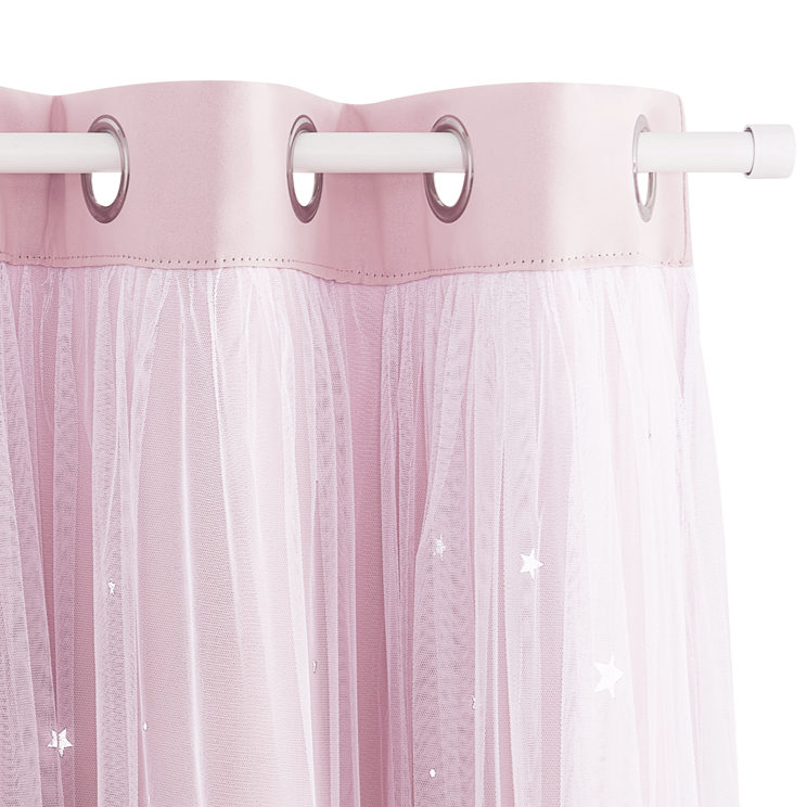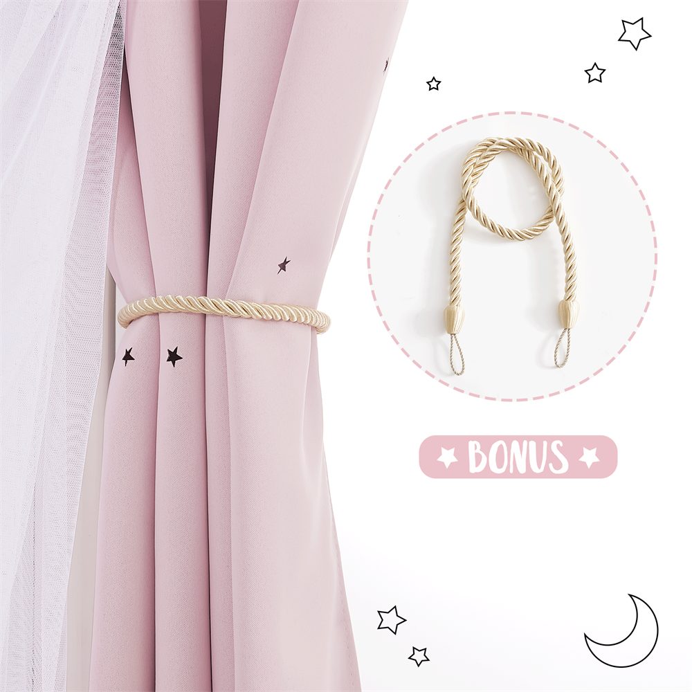 Vår Rosa Gardin med Tyll for barnerom er mer enn bare en gardin; den er et portrett av barndommens uskyld og undring. Hovedstoffet i en myk rosa nyanse gir et trygt og koselig bakteppe, mens det ytre laget av fint, hvitt tyll er prydet med glitrende stjerner. Disse stjernene fanger lyset vakkert og skaper en følelse av en stjerneklar natt, selv på dagtid. De praktiske maljene gjør opphengingen enkel og gir gardinen et moderne og ryddig utseende. Gardinen kan enkelt trekkes til siden og holdes på plass med de medfølgende dekorative båndene, som gir et elegant og lekent preg. Dette designet er skapt for å inspirere til lek, drømmer og en god natts søvn, og gjør barnerommet til et sted hvor magien aldri tar slutt.
