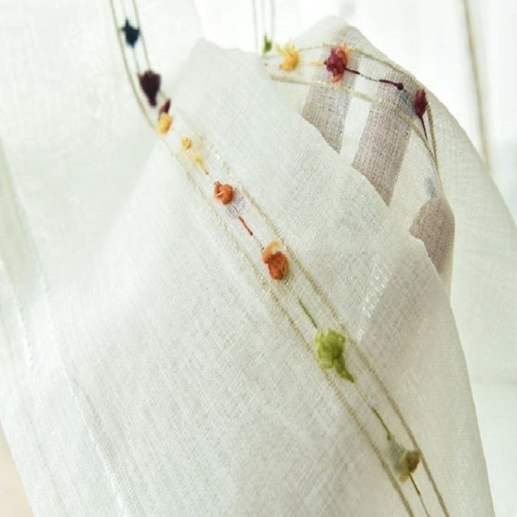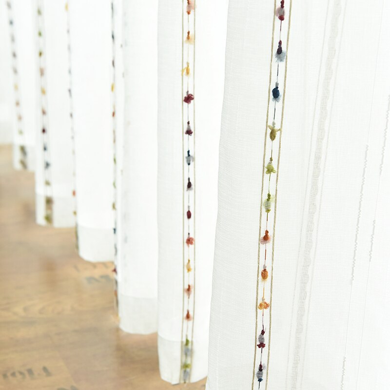 Frisk opp hjemmet ditt med vår lette og luftige lingardin, perfekt for å slippe inn lyset samtidig som den gir et snev av privatliv. Denne gardinen er laget av et tynt linmateriale av høy kvalitet, som gir den en naturlig tekstur og et elegant fall. Det unike med denne gardinen er de sjarmerende, fargerike detaljene som er vevd inn i stoffet – små, fargerike dusker eller knuter som løper langs kantene. Disse lekne elementene gir gardinen et personlig preg og en varm atmosfære, og passer perfekt inn i et nordisk-inspirert hjem eller et rom som trenger et lite fargekick. Forestill deg hvordan sollyset vil danse gjennom linet og fremheve de diskrete, men likevel iøynefallende, fargene.